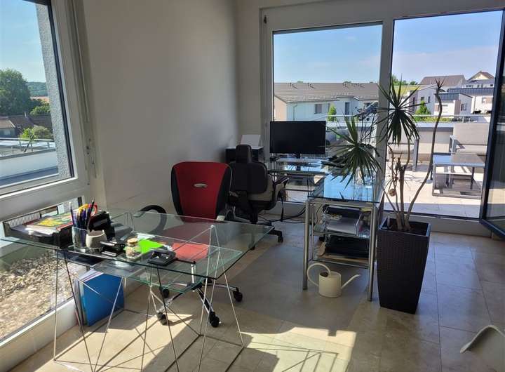 Über eine elegante Treppe gelangt man ins Dachgeschoss – ein lichtdurchflutetes Studio mit direktem Zugang zur Dachterrasse. Ob als Arbeitsplatz, Gästezimmer oder Rückzugsort zum Entspannen – dieser Raum bietet vielseitige Nutzungsmöglichkeiten.