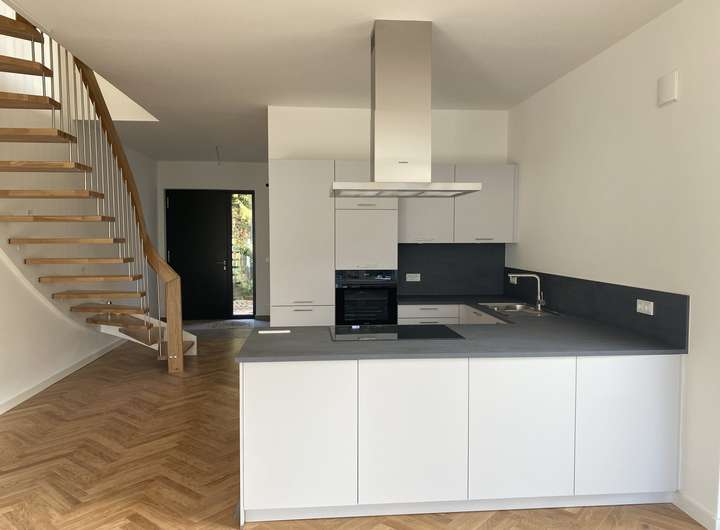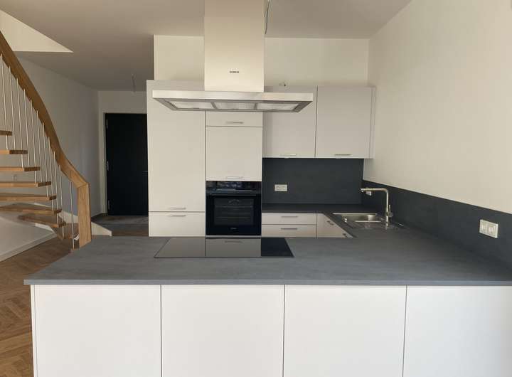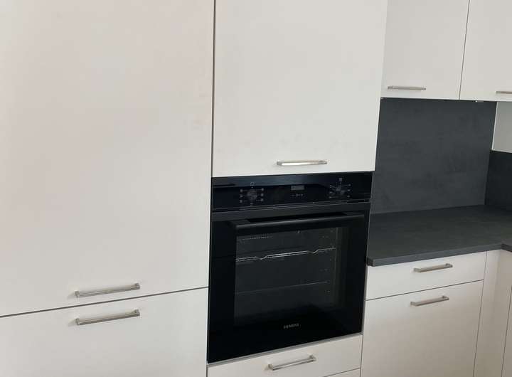 Die Küche ist mit einer Einbauküche mit elektrischen Markengeräten der Firmen Siemens und Liebherr ausgestattet. Zahlreiche Ober- und Unterschränke sorgen für reichlich Stauraum.