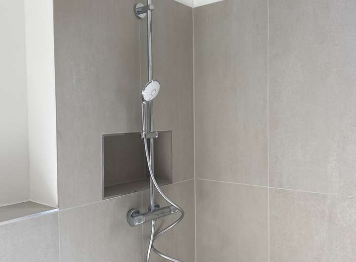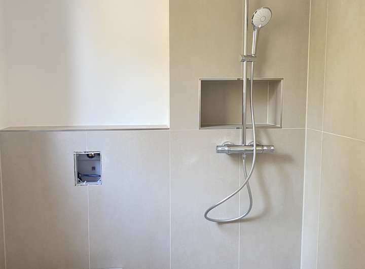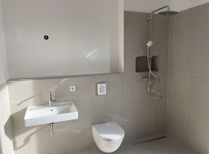 Das GästeWC ist mit einer ebenerdigen Dusche mit Regendusche, einem Handwaschbecken, einem HängeWC und einer Handtuchhalterheizung ausgestattet.