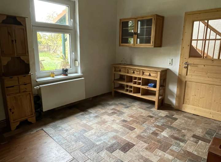 Im Erdgeschoss befinden sich auf rd. 77 m2 zwei Wohnräume, eine große Wohnküche, ein Wannenbad und ein Hauswirtschaftsraum. Von der Wohnküche ist ein rd 15 m2 großer Keller zu erreichen. In dem großen Wohnraum befindet sich ein Kaminofen.