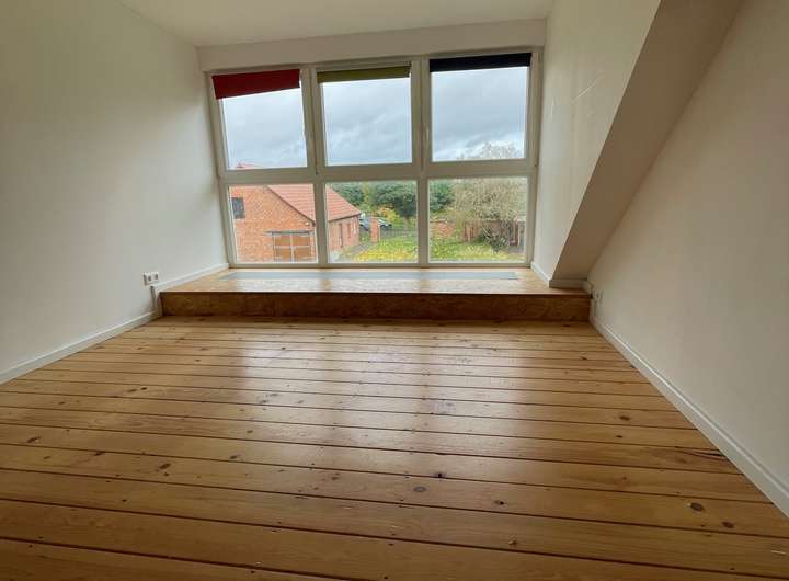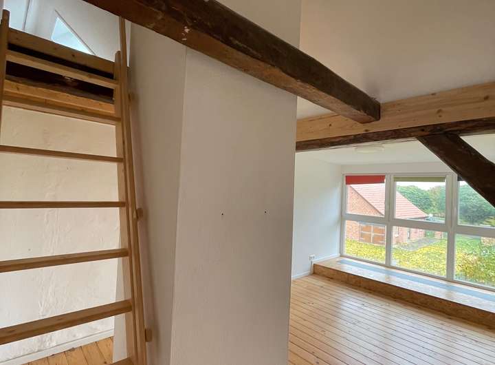 Im Dachgeschoss wurden rd. 65 m2 zum Wohnen, teilweise mit einer großzügigen Gaube, und mit einem Duschbad ausgebaut. Anschlüsse für den Einbau einer kleinen Küchenzeile sind vorbereitet. Über diese Einheit ist das nicht ausgebaute, aber gedämmte Lager zu erreichen.
