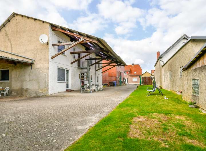 Das weitläufige Grundstück bietet zahlreiche Nutzungsmöglichkeiten: Zwei Garagen, mehrere Außenstellplätze, ein überdachter Innenhof sowie ein gepflegter Garten schaffen Raum für Freizeit, Hobby und Erholung.