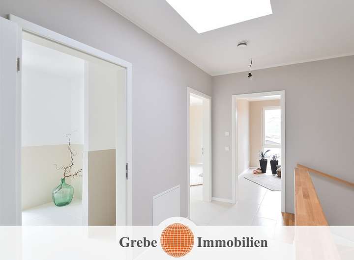Im Obergeschoss erwartet Sie ein großzügiges Familienbad mit Badewanne und Dusche, ein Elternschlafzimmer sowie zwei weitere Räume, die sich ideal als Kinderzimmer, Homeoffice oder Gästezimmer nutzen lassen.