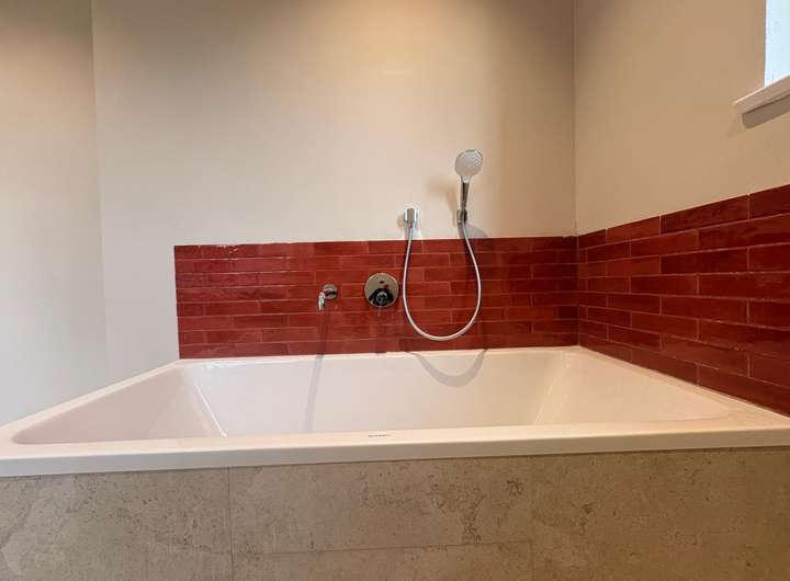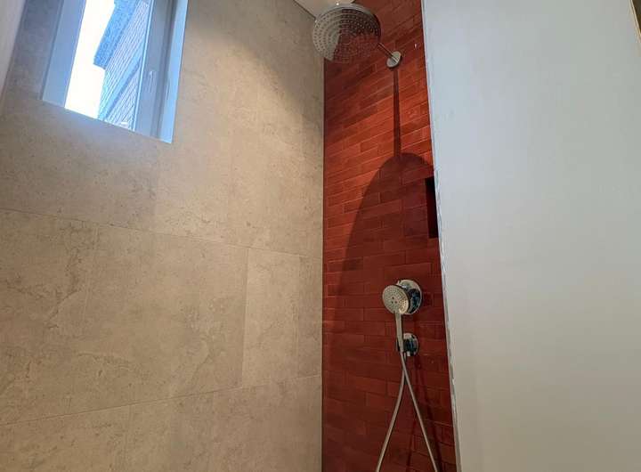 Bad: Regendusche, Badewanne, Handtuchheizkörper und Fußbodenheizung