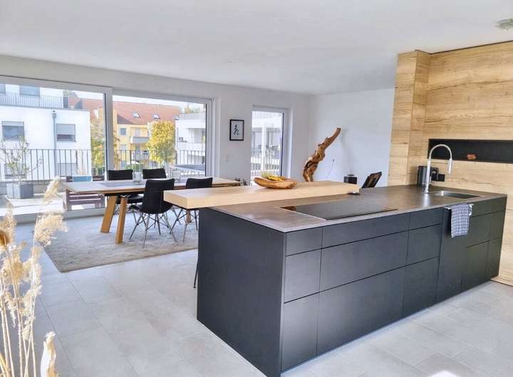 Der Mittelpunkt der Wohnung ist der helle Wohn- und Essbereich mit zahlreichen bodentiefen Fenstern, die für ein besonders angenehmes Wohnambiente sorgen. Die geschmackvolle, offene Einbauküche, die auf Wunsch gegen eine Ablöse übernommen werden kann, fügt sich harmonisch in den Wohnbereich ein.