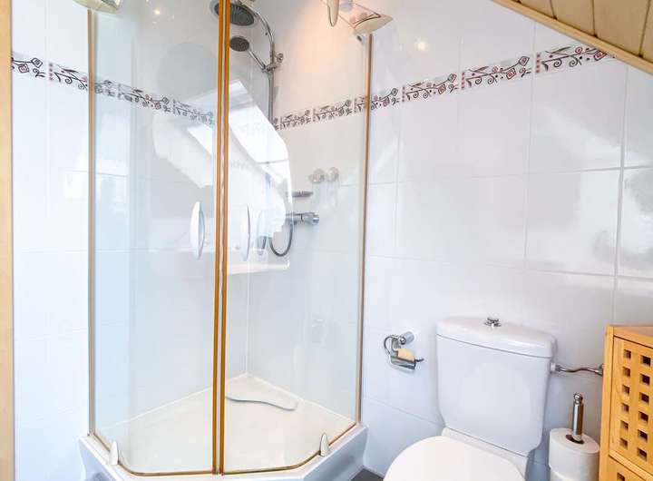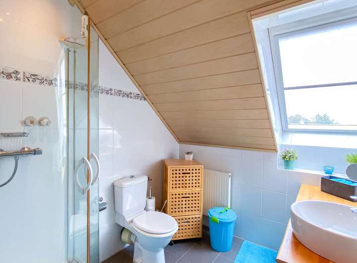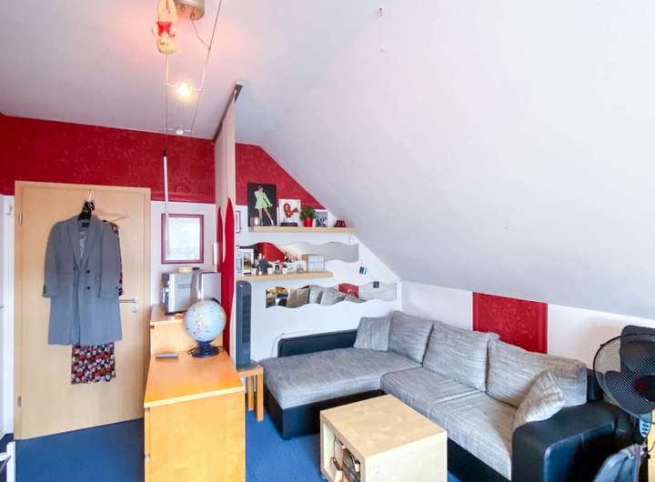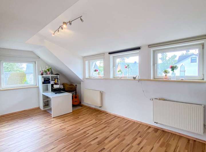 Das Dachgeschoss beherbergt zwei großzügige Kinderzimmer, die jeweils mit unterschiedlichen Bodenbelägen ausgestattet sind – eines mit Laminat, das andere mit Teppich. Ergänzt wird die Etage durch ein weiteres Tageslichtbad, das mit einer Glasduschkabine, einem WC und einem Waschbecken ausgestattet und vollständig gefliest ist. Über eine Falttreppe gelangt man auf den Spitzboden, der zusätzlichen Stauraum bietet.