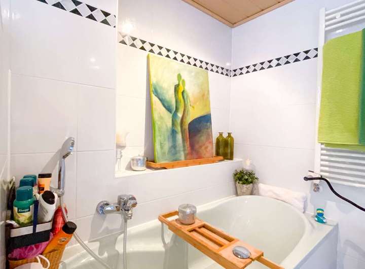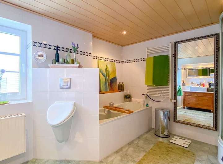 mit zwei Glas-Duschkabinen, einer Badewanne und einem Bidet (jeweils eines im 1.OG und DG)