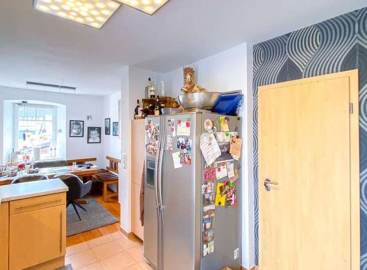 Das Erdgeschoss des Hauses besticht durch ein gemütliches und lichtdurchflutetes Wohnzimmer, das direkt in das angrenzende Esszimmer übergeht. Die offene Küche, die sich nahtlos in den Wohnbereich einfügt, verfügt über einen Zugang zur Terrasse mit nordöstlicher Ausrichtung. Direkt an die Küche angeschlossen befindet sich ein praktischer Abstellraum für Lebensmittel, von dem aus man in den Gewölbekeller gelangt. Während im Wohn- und Esszimmer stilvolle Massivholzdielen für eine warme Atmosphäre sorgen, ist die Küche im mediterranen Stil gefliest.
