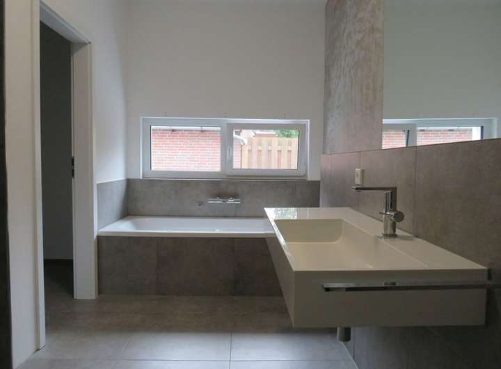 Gäste-Bad im EG: ebenerdige Dusche, Badewanne, WC, Fenster