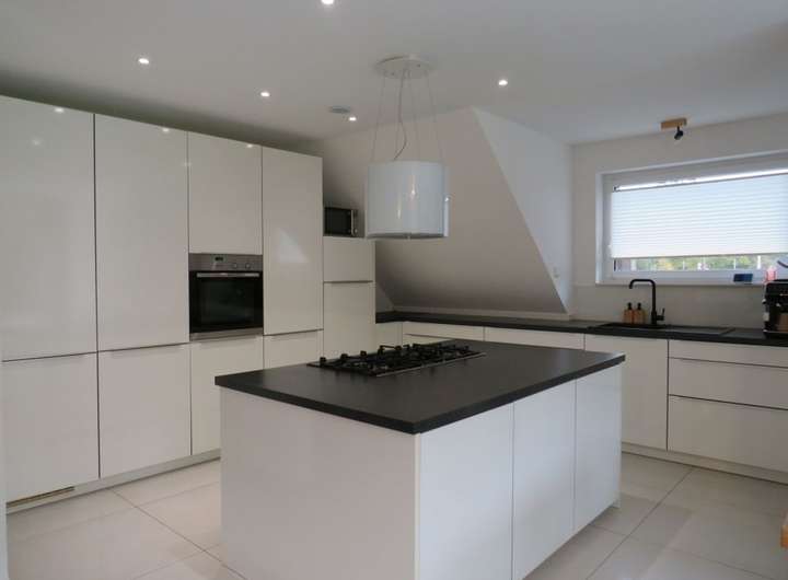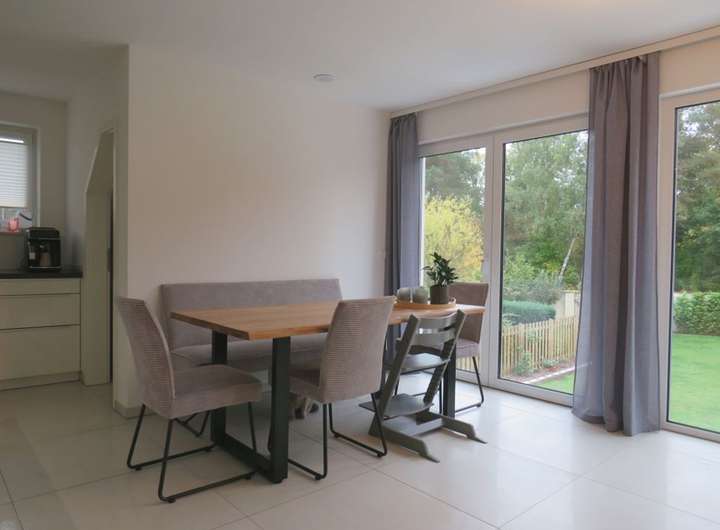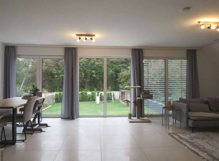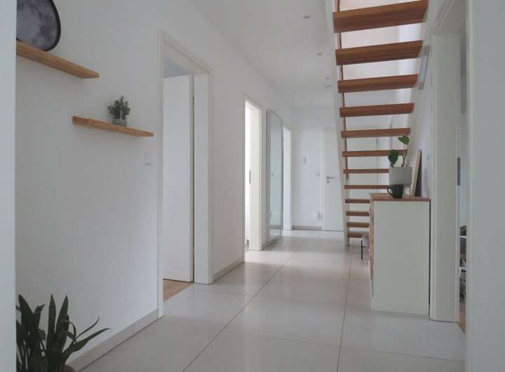 Im Erdgeschoss erwartet Sie eine Wohnfläche von etwa 120 m² mit einem offenen Wohn- und Essbereich sowie Übergang in die Küche mit angrenzender Speisekammer. Von hier