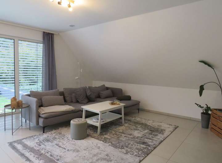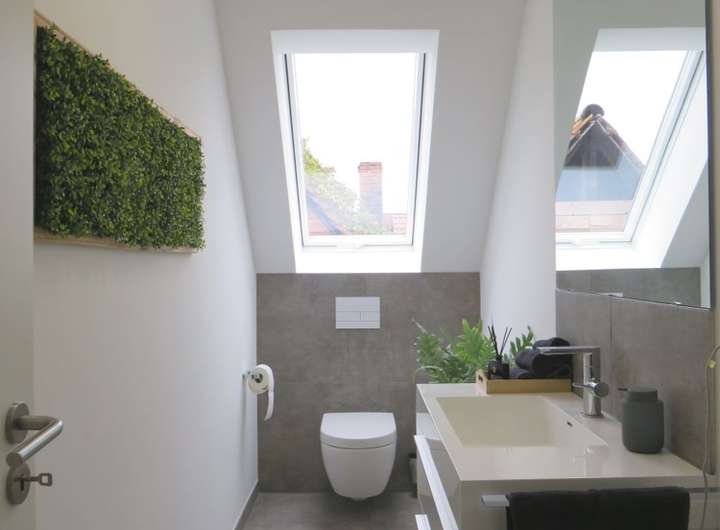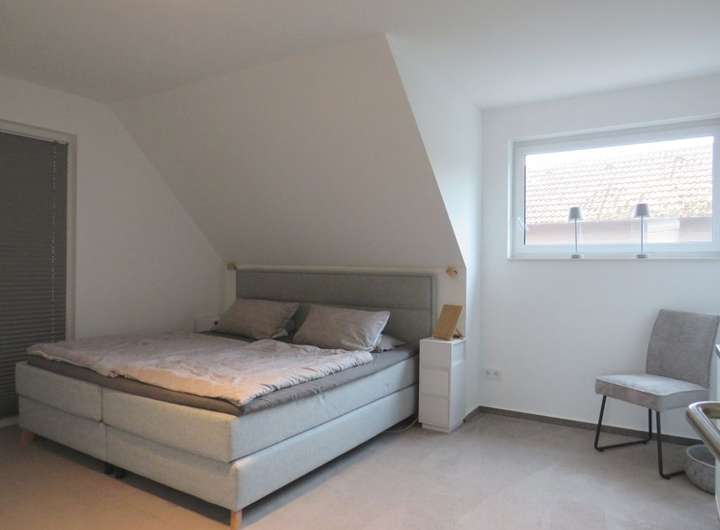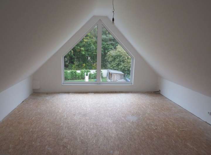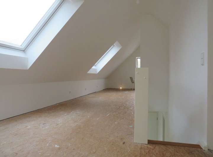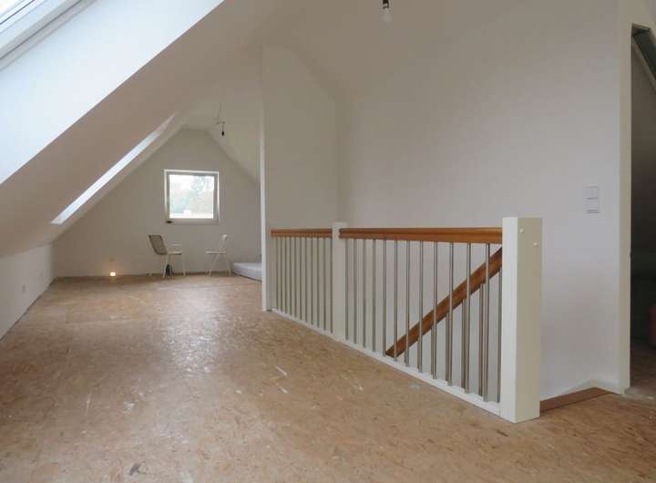 Das lichtdurchflutete Obergeschoss bietet einen offenen Wohnbereich mit Küche und Speisekammer. Von hier haben Sie eine wunderbare Sicht über den Garten. Bodentiefe Fenster bieten hier die besten Voraussetzungen für den Anbau eines Balkons, um den Wohnkomfort zu steigern. Darüber hinaus stehen Ihnen im OG drei Schlafzimmer, ein Gäste-WC sowie ein komfortables Badezimmer zur Verfügung. Das ausgebaute Dachgeschoss (ca. 50 m²) bietet Ihnen zusätzlichen Platz für ein Arbeitszimmer oder ein Studio.
