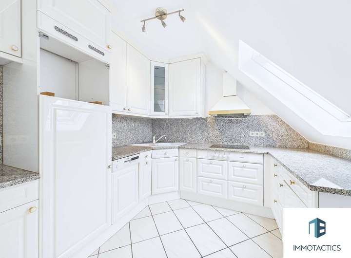 Mit großzügiger Arbeitsfläche, Oberlicht und klassischem Weiß fügt sich die Küche harmonisch in den Raum ein. Sie bietet eine solide Grundlage für den Alltag – ideal für alle, die nicht sofort modernisieren möchten, aber sich langfristig Gestaltungsspielraum offenhalten wollen.
