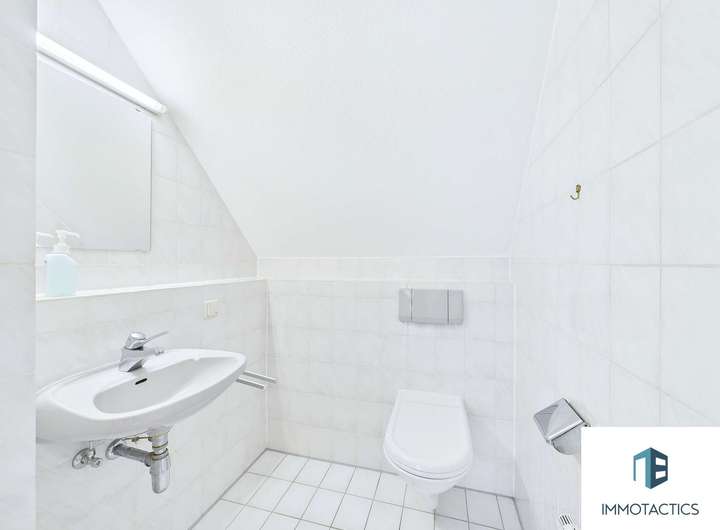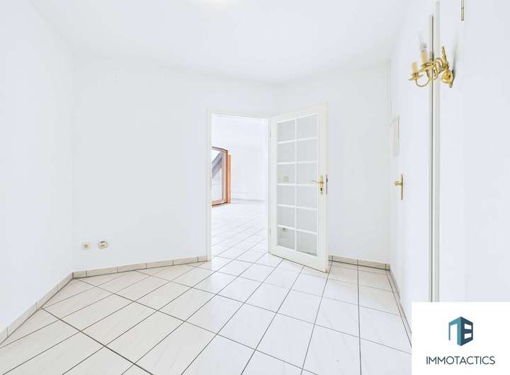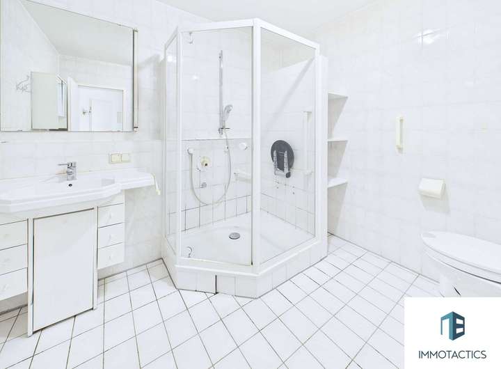 Ergänzt wird das Raumangebot durch ein separates Gäste-WC, ein Duschbad, einen praktischen Abstellraum sowie einen angenehm geschnittenen Flur, der durch weiße Fliesen, goldenen Akzenten und einer verglasten Tür zum Wohnbereich beinahe französisches Flair versprüht. Komfort mitten in der Stadt: