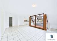 Beim Verlassen des Aufzugs befindet man sich direkt auf der obersten Etage, die ausschließlich von dieser Wohnung genutzt wird – hier genießt man vollständige Ruhe ohne Nachbarn. Betritt man diese Wohnung, empfängt einen ein weitläufiger, fast schwebend wirkender Wohnraum, der mit seiner intelligenten Struktur und Helligkeit besticht. Große Fensterflächen mit markanter Holzrahmung durchfluten das Wohnzimmer mit Tageslicht – ein Spiel aus Licht und Linien, das sich über die gesamte Wohnfläche erstreckt. Von hier aus öffnet sich die Tür zur Loggia – ein Rückzugsort über den Baumwipfeln, ruhig, grün und dennoch mitten in der Stadt.