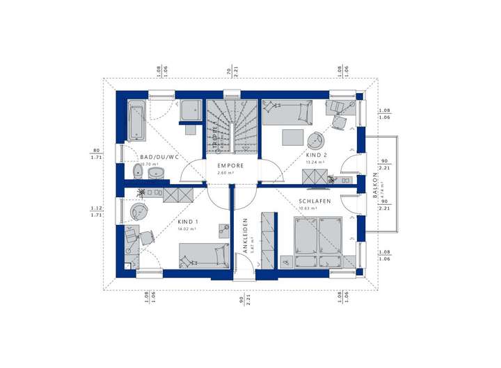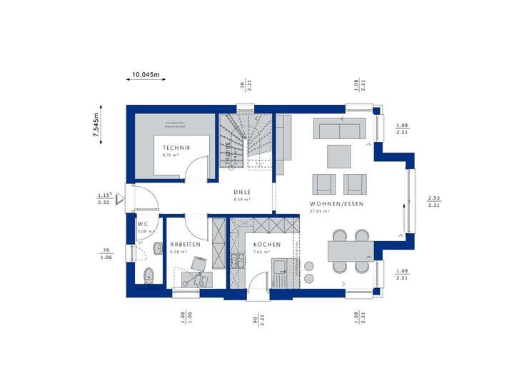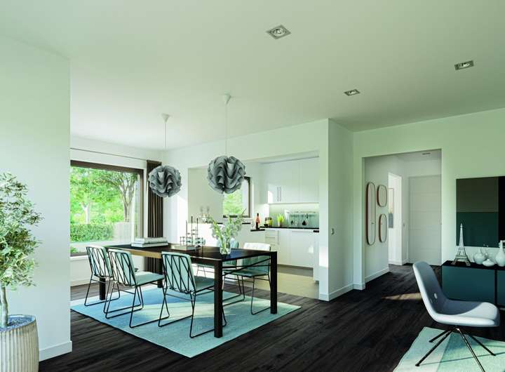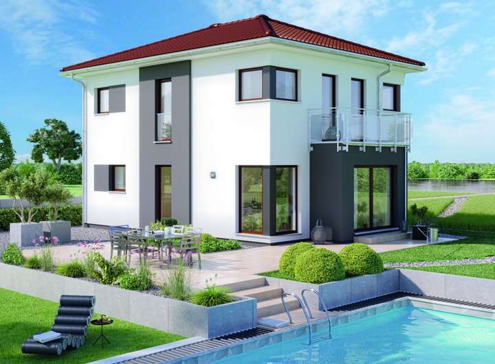 Diese repräsentative Stadtvilla macht nicht nur in begehrten City-Lagen eine gute Figur, sie begeistert auch auf dem Land mit ihrem urbanen Flair. Charakteristisch ist das Walmdach, das den schlichten, quaderförmigen Baukörper krönt. Es strahlt mit seinem klassischen Rotton einen herrschaftlichen Charakter aus und erfüllt gleichzeitig auch praktische Zwecke. So erweist es sich als besonders stabil, langlebig und vor allem pflegeleicht. Zudem ermöglicht es eine uneingeschränkte Nutzung des Obergeschosses ganz ohne störende Schrägen. Dank der zusätzlichen Dachflächen bietet es beste Voraussetzungen für die Installation einer Photovoltaikanlage. Erweitert wird das Fertighaus von einem eleganten Rechteck-Erker, auf dessen Dach ein sonnenverwöhnter Balkon Platz findet. In einem edlen Dungelgrau gehalten setzt er zusammen mit der Fassadenaufdopplung einen spannenden Kontrast zur weiß verputzten Fassade. Selbstverständlich können sich die Bauherren auch für einen anderen Farbton entscheiden. So wird aus dem EDITION 123 ein echtes Unikat, das die Persönlichkeit seiner Bewohner widerspiegelt. Genauso individuell wie das Äußere lässt sich das Innere der Stadtvilla gestalten. Das fängt bereits bei der Aufteilung des Grundrisses an. Dieses Planungsbeispiel ist ausgerichtet auf den Alltag einer vierköpfigen Familie. Empfangen werden Bewohner und Besucher von einer geräumigen Diele. Schon von der Haustür aus fällt der Blick durch den offen angelegten Wohn- und Essbereich bis hinaus in den Garten. Über Eck schließt sich die Küche an das lichtdurchflutete Raumensemble an. Sie besitzt einen eigenen Zugang zur großen Terrasse, sodass Geschirr und Speisen ohne Umwege nach draußen gebracht werden können. Neben den Gemeinschaftsräumen befinden sich im Erdgeschoss noch ein Gäste-WC, ein geräumiges Büro und ein Technik- bzw. Hauswirtschaftsraum. Eine platzsparende halbgewendelte Treppe führt hinauf in das Obergeschoss. Die Wohnfläche teilen sich hier zwei Kinderzimmer, der Elternschlafraum mit integriertem Ankleidebereich sowie ein gemütliches Familienbad, das sich mit einer großen Wanne, einem Doppelwaschtisch und einer bodengleichen Dusche ausstatten lässt.