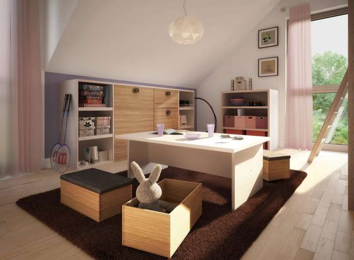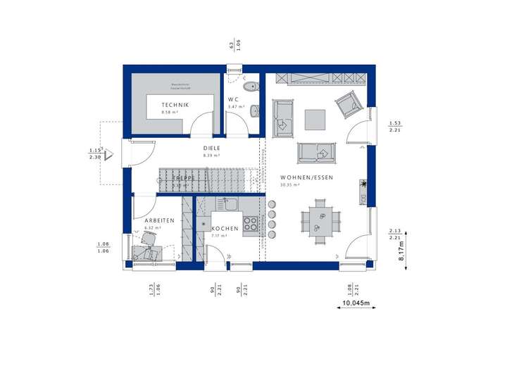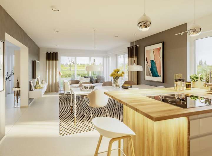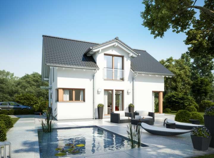 Ein eigenes Haus ist für die meisten Menschen mehr als nur ein Dach über dem Kopf. Es ist ein Ruhepol inmitten der Hektik des Alltags. Ein Ort, wo man einfach man selbst sein kann. Zur persönlichen Wohlfühloase kann auch dieses Fertighaus werden. Das äußere Erscheinungsbild ist sehr traditionell geprägt: Auf einem quaderförmigen, weiß verputzten Baukörper thront ein Satteldach mit weiten Dachüberständen. Dadurch ist der Entwurf mit den meisten Bauvorschriften kompatibel. Harmonisch fügt sich der Zwerchgiebel mit Satteldach in die Architektur ein. Wer sich noch mehr Persönlichkeit wünscht, kann sein Haus auch mit einem Erker, Gauben oder einem Balkon erweitern. Schöne Akzente setzen die holzfarbenen Fensterrahmen, die dem Gebäude einen freundlichen, einladenden Charakter verleihen. Das Innere bietet auf einer Wohnfläche von mehr als 130 m² einer vierköpfigen Familie komfortabel Platz. Der Grundriss folgt dem klassischen Prinzip "unten wohnen, oben schlafen" und sorgt mit seiner klaren Struktur für einen reibungslosen Tagesablauf. Die Verkehrswege wurden bewusst reduziert, damit dem Familienleben möglichst viel Raum zukommt. Links an den Eingangsbereich schließt sich der Technikraum an. Rechts liegt das helle Homeoffice, das ein konzentriertes und ungestörtes Arbeiten ermöglicht. Die lange Wand bietet sich für elegante Regale an, in denen Aktenordner und Bücher ordentlich verstaut werden können. Es ist natürlich auch möglich, den Raum als Gäste- oder als Hobbyzimmer einzurichten. Der hintere Bereich des Hauses, der sich über bodentiefe Verglasungen und Fenstertüren zum Garten hin öffnet, ist den Gemeinschaftsräumen vorbehalten. Fließend gehen die einzelnen Bereiche ineinander über und schaffen so eine ganz besondere familiäre Nähe. Eine moderne, geradläufige Treppe führt hinauf in das Dachgeschoss. Um eine kompakte Empore gruppieren sich zwei schöne Kinderzimmer, ein Elternschlafraum mit ausreichend Stellmöglichkeiten für einen großen Kleiderschrank sowie das Familienbad.