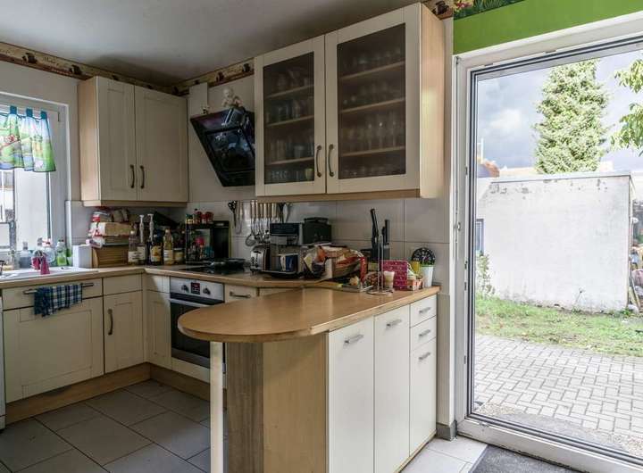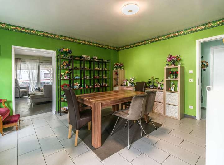Im Erdgeschoss befindet sich ein einladender Eingangsbereich mit Diele, ein Gäste-WC, ein Heizungs- und Abstellraum sowie ein weitläufiger Wohn- und Essbereich mit offener Küche. Auf der linken Seite schließt sich ein zusätzlicher Wohntrakt an, der ursprünglich als separate Einliegerwohnung mit eigenem Eingang konzipiert wurde. Dieser Bereich umfasst ein Wohnzimmer (derzeit als Esszimmer genutzt), eine zweite Küche, ein Schlafzimmer sowie ein Badezimmer mit Dusche.