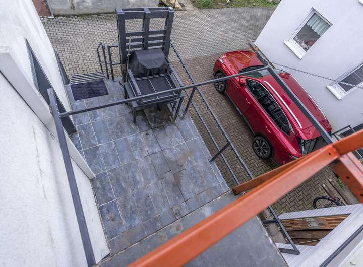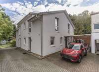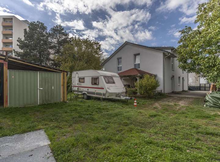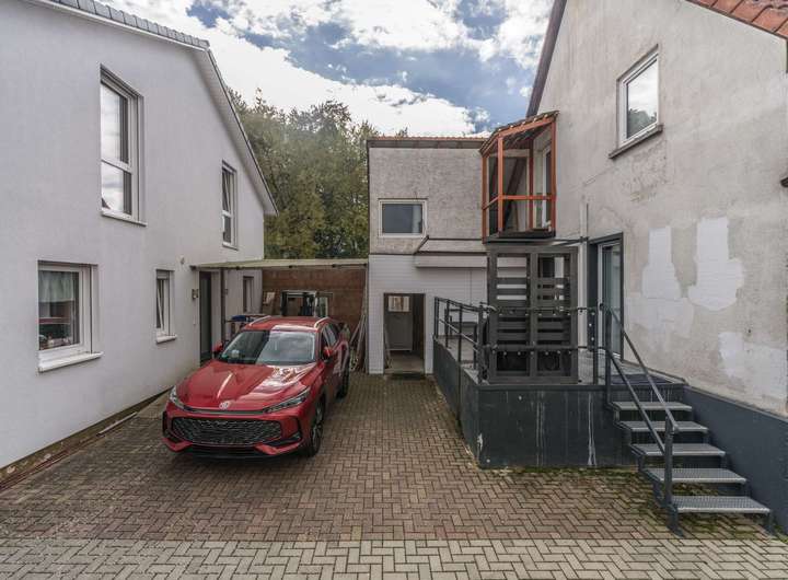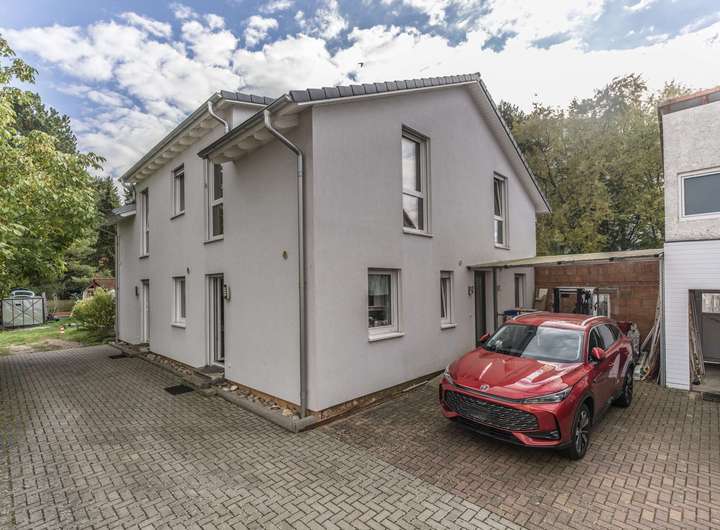 Das hintere Gebäude, ein Bien-Zenker Fertighaus aus dem Jahr 2012, befindet sich in einem modernen Zustand. Es lässt sich flexibel sowohl als Einfamilienhaus als auch mit einer abtrennbaren Einliegerwohnung nutzen.