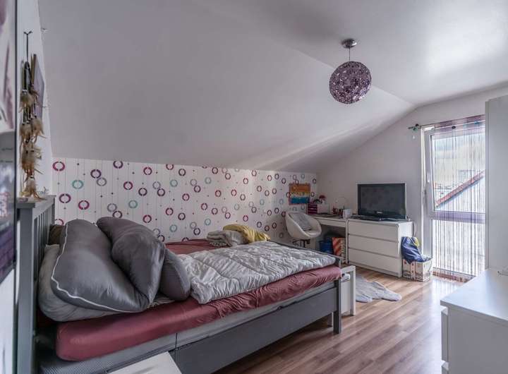 Im Obergeschoss befinden sich vier großzügige Schlafzimmer sowie zwei Badezimmer. Das Hauptbadezimmer ist mit Badewanne und Dusche ausgestattet, das zweite Badezimmer verfügt über eine zusätzliche Dusche. Das gesamte Haus verfügt über eine Fußbodenheizung und wird über eine Gas-Zentralheizung beheizt.
