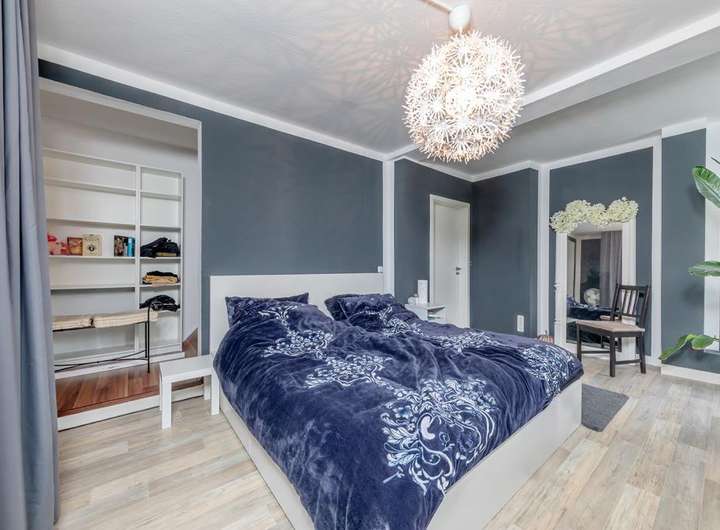 Über die massive Treppe im Obergeschoss angelangt, erreichen Sie rechter Hand das Elternschlafzimmer, in welchem sich problemlos ein großzügiges Doppelbett unterbringen lässt. Ein separierter Bereich dient praktischerweise als begehbarer Kleiderschrank.