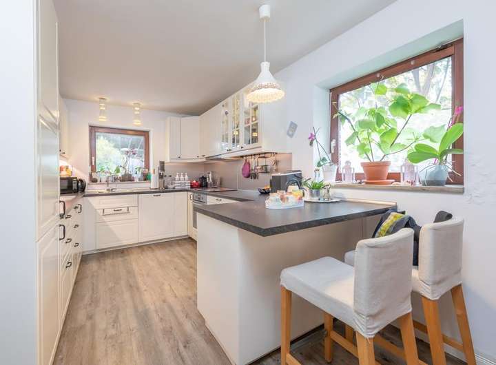 Rechter Hand befindet sich die Küche, welche mit einer zeitlosen, voll ausgestatteten Einbauküche versehen ist und mit gleich zwei Fenstern für optimale Belüftung und angenehmen Lichteinfall zu überzeugen weiß.
