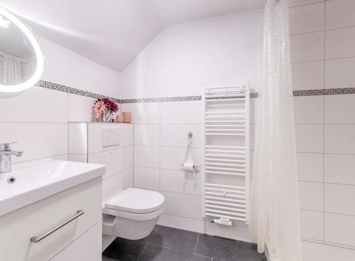 Abgerundet wird diese Ebene durch ein stilvolles, mit weißen Wand- und grauen Bodenfliesen versehenes Duschbad.
