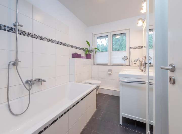 Angrenzend befindet sich das identisch zum Bad im Erdgeschoss geflieste Vollbad, welches mit einem Fenster für optimale Belüftung überzeugt.