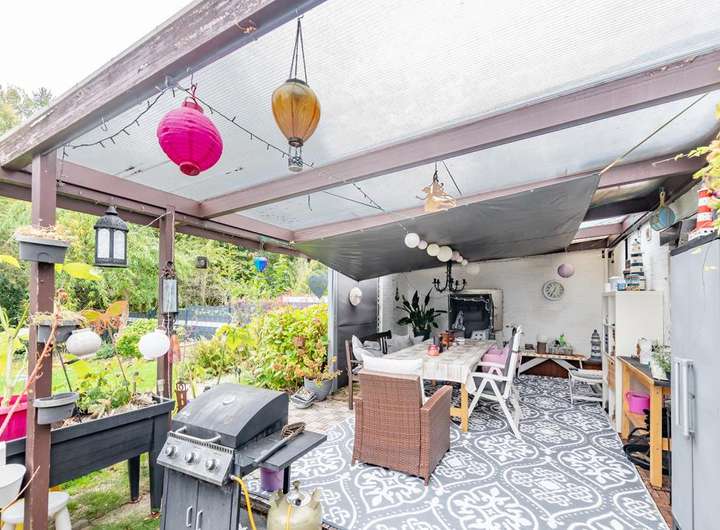 Das ca. 439 m² große und pflegeleicht angelegte Südgrundstück ist blickdicht eingewachsen und kann mit einer überdachten, gepflasterten Terrasse glänzen. Hier lassen sich wunderbare Grillabende mit der Familie verbringen und entspannte Stunden im Freien genießen.