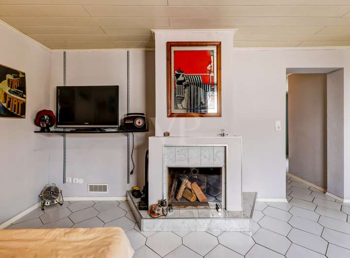 Der Wohnbereich im Obergeschoss ist offen gestaltet und lädt mit seinem gemütlichen Kamin zu entspannten Stunden ein – ob beim Lesen, einem Glas Wein oder einfach beim Abschalten nach einem langen Tag.