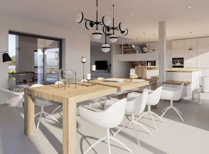 Dieses schöne Haus zieht mit seinem spannend gegliederten Baukörper und der kontrastreichen Gestaltung alle Blicke auf sich. Die Basis des Gebäudes bildet ein großzügig dimensionierter Quader, der an den kurzen Seiten von zwei lichtdurchfluteten Übereck-Erkern erweitert wird. On top befindet sich jeweils ein schöner, mit einer Glasbrüstung eingefasster Balkon. Sie passen sich perfekt dem Lauf der Sonne an: Auf dem einen Freisitz kann man den Sonnenaufgang genießen, auf dem anderen das romantische Abendrot. Die Fassade zeigt sich in einem ausdrucksstarken Hell-Dunkel-Kontrast: Während das Erdgeschoss überwiegend weiß verputzt wurde, hüllt sich ein großer Bereich des Obergeschosses in einen eleganten Grauton. Fast scheint es seinem Betrachter entgegenzukommen. Wer es gern etwas natürlicher mag, kann das Obergeschoss auch in eine Holzverschalung kleiden. Akzente setzen die Stelen, die sich an das Fertighaus anschließen und eine fast schon skulpturale Wirkung erzielen. Nahtlos fügt sich die Eingangsüberdachung an eine dieser monolithischen Säulen an. Egal ob es regnet oder schneit, dank des Vordachs kann man in Ruhe nach dem Haustürschlüssel suchen, ohne dabei nass zu werden. Im Inneren des Hauses werden die Besucher von einem Windfang mit Garderobenbereich empfangen, wo sie Jacken, Mützen und Schirme ablegen können. Das Erdgeschoss gliedert sich in zwei Bereiche: Rechts liegt der Bürotrakt mit zwei großen Arbeitszimmern, eines davon mit Zugang zum Technikraum, und einem Bad mit Dusche. Links liegen die Gemeinschaftsräume, ein offenes Ensemble aus den Bereichen Wohnen, Essen und Kochen, die um eine kleine Speisekammer ergänzt werden. Dank der breiten Fensterfronten und der Übereck-Verglasung herrscht hier eine besonders luftige Atmosphäre. Zum Verweilen lädt nicht nur die Couchlandschaft ein, sondern auch das gemütliche Sitzfenster neben der langen Esstafel. Eine geradläufige Faltwerktreppe führt hinauf in das Obergeschoss, das für eine Familie mit zwei Kindern konzipiert wurde. Zwei Kinderzimmer, ein großer Masterbedroom mit vorgelagertem Ankleidebereich und ein schickes Familienbad sorgen hier für Wohlbefinden.