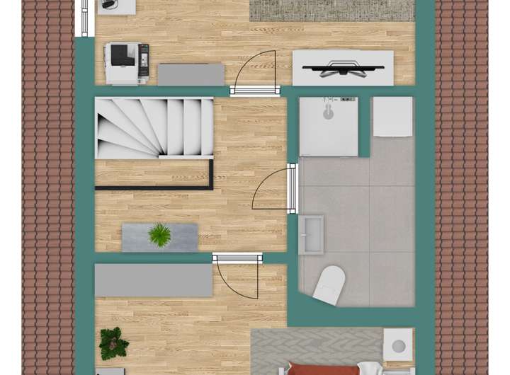 Auf derselben Ebene befindet sich außerdem ein modernes Duschbad sowie ein ruhiges Schlafzimmer, das sich ideal als Elternschlafzimmer eignet.
