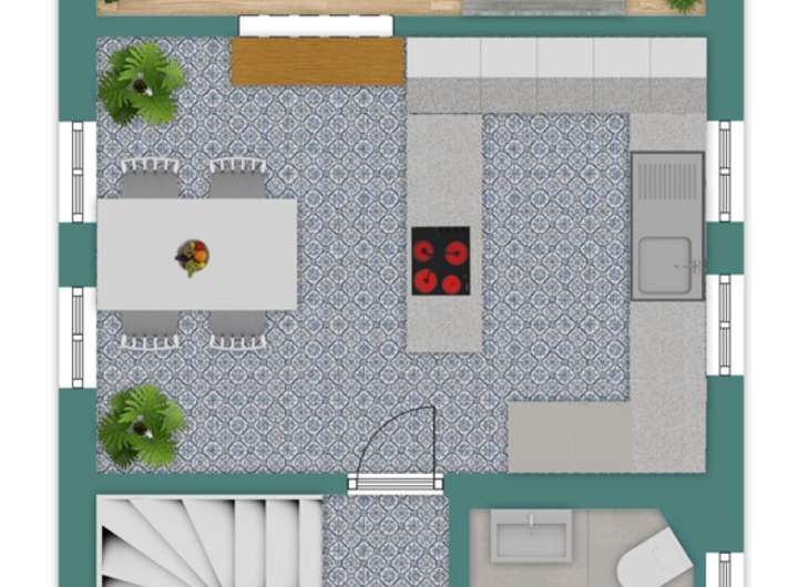 Im Erdgeschoss empfängt Sie eine einladende Diele mit Platz für Ihre Garderobe. Von hier aus gelangen Sie in die großzügige Wohnküche, die mit einer modernen, geschmackvollen Einbauküche ausgestattet ist. Der Raum bietet ausreichend Platz für einen großen Esstisch – perfekt für gemeinsame Mahlzeiten mit Familie oder Freunden.