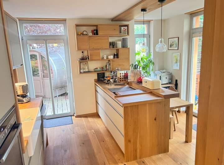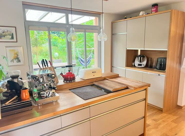 - Küche (maß angefertigt und nicht im Kaufpreis enthalten) mit Blick in den Garten und auf die überdachte Terrasse und angrenzender Speisekammer