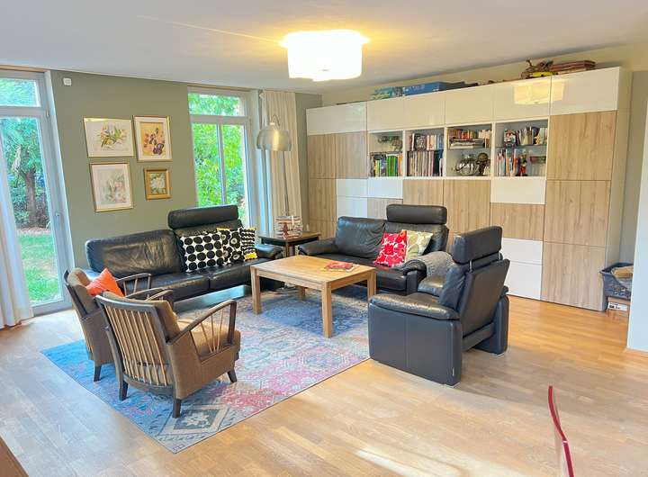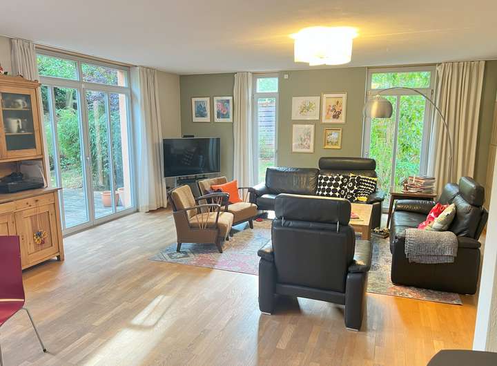 - Großer Wohn-/Essbereich lichtdurchflutet, mit großen Fenstern und Blick in den Garten