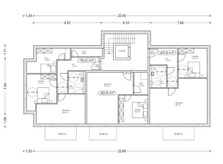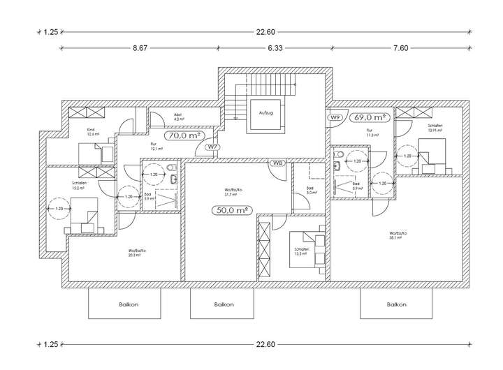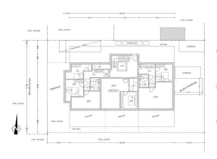 - EG, 1. OG und 2. OG: jeweils 3 Wohnungen mit 50, 69 bzw. 70 m²