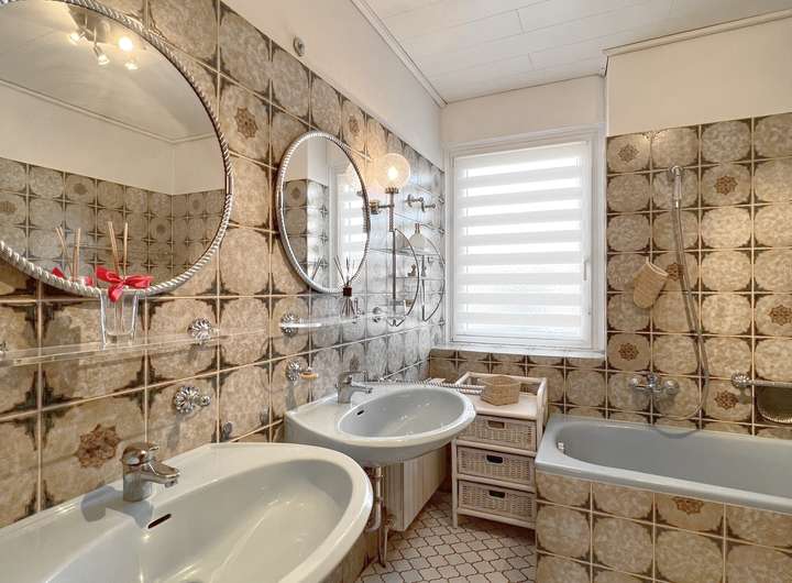 - Badezimmer mit Wanne, fast ebenerdiger Dusche/Glasduschkabine und Fenster