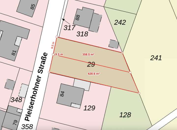Die Breite beträgt ca. 9,5m und die mittlere Tiefe ca. 38m. Das Grundstück kann mit einer Doppelhaushälfte bebaut werden. Es handelt sich dann um eine Grenzbebauung. Der (künftige) Nachbar bebaut dann das etwas größere Grundstück - ca. 425qm | € 140.000,- - ebenso mit einer Doppelhaushälfte. Ideal für befreundete Familien bzw. Generationenwohnen.