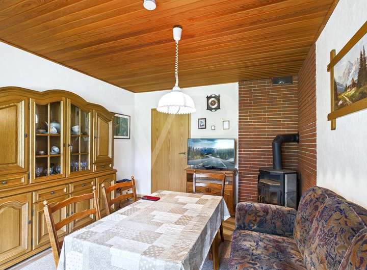 Das geräumige Wohnzimmer punktet mit breiten Fensterflächen, die viel Licht hereinlassen und dem Raum eine behagliche Atmosphäre verleihen. Hier lässt sich ein einladender Lebensmittelpunkt gestalten – sei es für gemütliche Abende im Kreis der Familie oder ruhige Stunden mit Blick in den Garten. Direkt angrenzend befindet sich das Esszimmer mit Kaminofen, das sich ideal für gesellige Mahlzeiten oder lange Abende mit Freunden anbietet – eine klare Einladung zum Zusammensein.