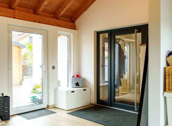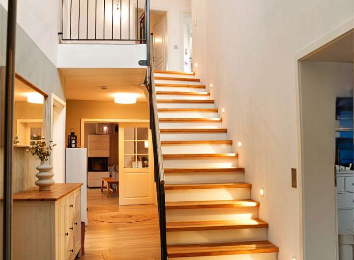 Ein besonderes Highlight ist der großzügige Eingangsbereich, der repräsentativ gestaltet ist und viel Platz für Garderobe und Stauraum bietet.