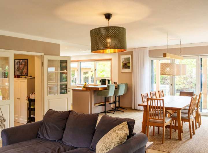 Im Erdgeschoss erwartet Sie ein großer, offener Wohn-, Ess- und Kochbereich, der durch große Fensterflächen lichtdurchflutet ist und einen herrlichen Blick in den Garten bietet.