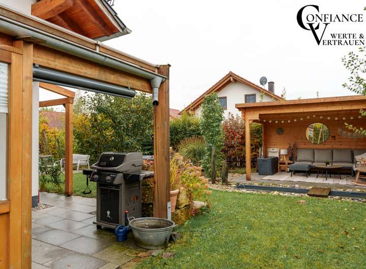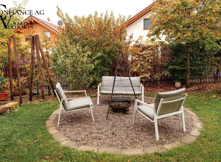 Der liebevoll angelegte Garten lädt zum Verweilen ein – gepflegte Rasenflächen, ein charmantes Wasserspiel, eine überdachte Liegefläche sowie eine offene Grillstelle schaffen eine Oase der Entspannung – perfekt für gemütliche Sommerabende im Kreis der Familie oder mit Freunden.