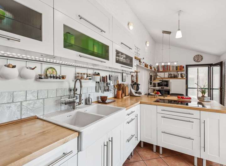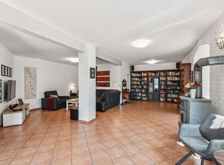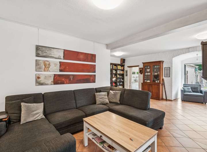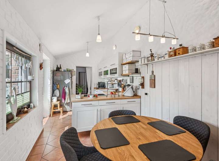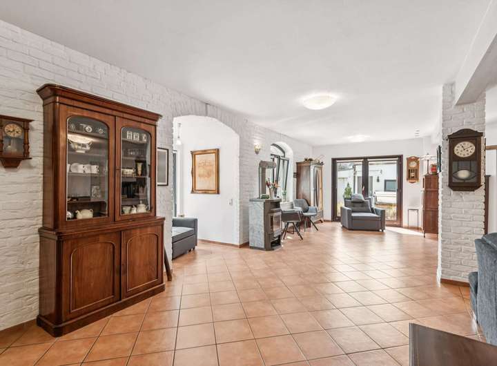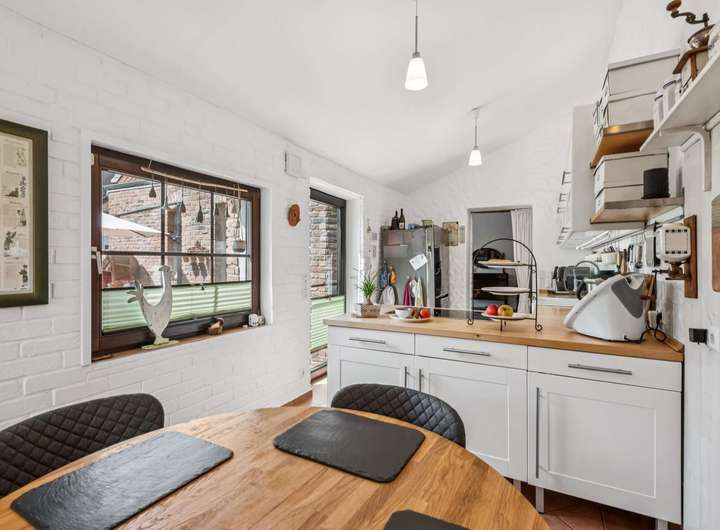 Die Inszenierung ist Programm: Das Hinterhaus – das eigentliche Haupthaus – liegt bewusst versteckt. Der Zugang erfolgt über eine schlichte Seitentür. Drinnen öffnet sich ein lichtdurchflutetes Wohnrefugium mit ca. 190 m² Wohnfläche: großzügiger Wohn-/Essbereich mit Kamin, hochwertige Böden, klare Architektur. Die moderne vollausgestattete Küche schließt direkt an und führt über eine große Tür in den überdachten Außenbereich – perfekt für lange Sommerabende, Familienfeste und entspannte Grillrunden.