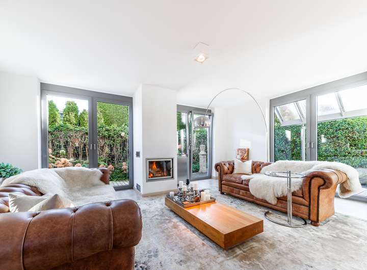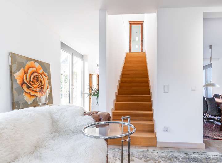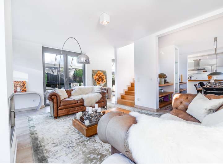 Die hochwertige Ausstattung spiegelt sich in der gehobenen Einbauküche, dem eleganten Kamin und dem gepflegten Echtholz-Interieur wider. Die sonnige Terrasse lädt zu entspannten Stunden im Freien ein, während der liebevoll angelegte Garten Raum zur Erholung und individuellen Gestaltung bietet.