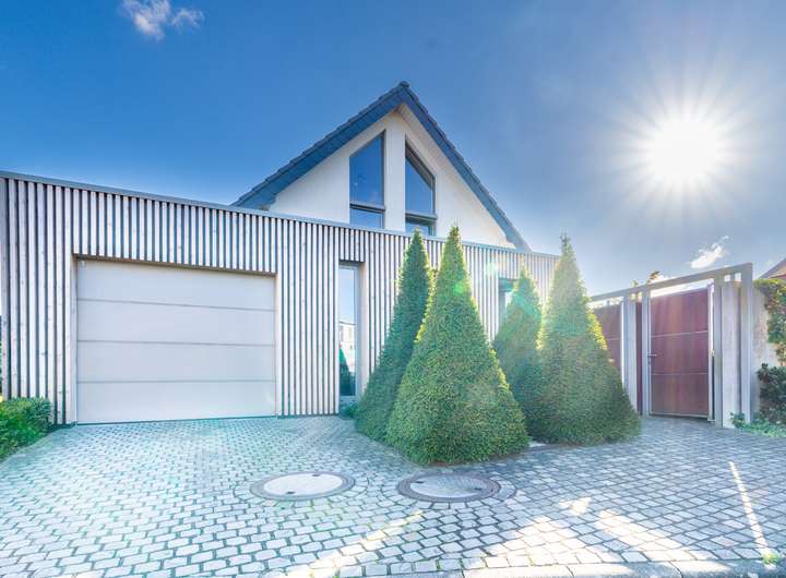 Das Haus verfügt über zwei separate Eingänge – ideal, um Wohnen und Arbeiten geschickt zu kombinieren oder beispielsweise ein Büro im Erdgeschoss und einen privaten Wohnbereich im Obergeschoss zu gestalten.