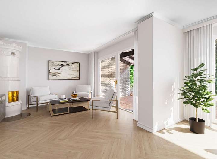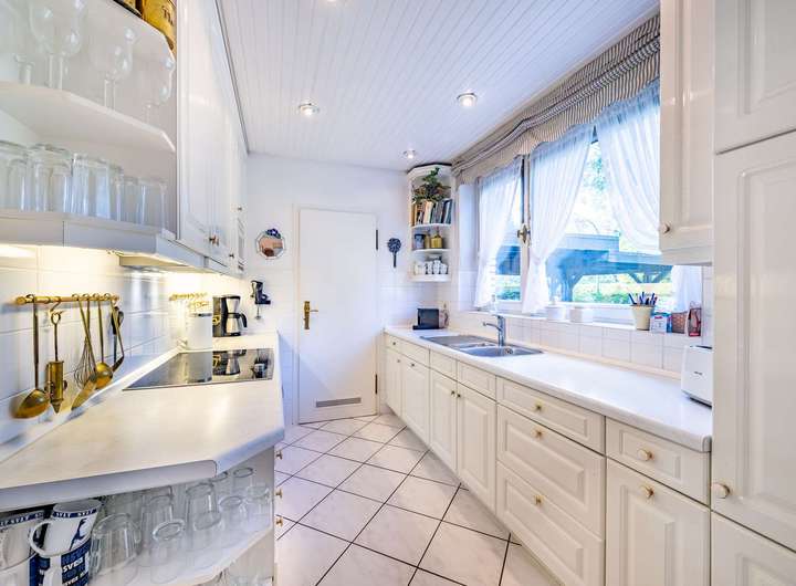 Ausgehend von der hellen Küche mit separatem Abstellraum erreichen Sie das geräumige Wohnzimmer, welches tagsüber durch seine bodentiefen Fenster mit Tageslicht versorgt wird und abends zum Entspannen am Kachelofen einlädt. Absolutes Highlight ist der nach Süden ausgerichtete Garten, der Sie und Ihre Familie zu actionreichen Tobereien und gemütlichen Grillabenden mit Freunden einlädt.