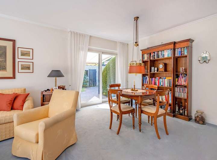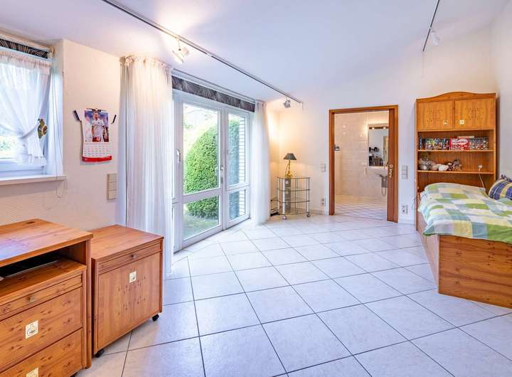 Der Anbau verfügt über ein weiteres Zimmer, ein komfortables Duschbad und ein Gäste-WC, die in Richtung des Vordergartens ausgerichtet sind. Bei diesem Anbau handelt es sich um zusätzliche, barrierefreie Wohnfläche.