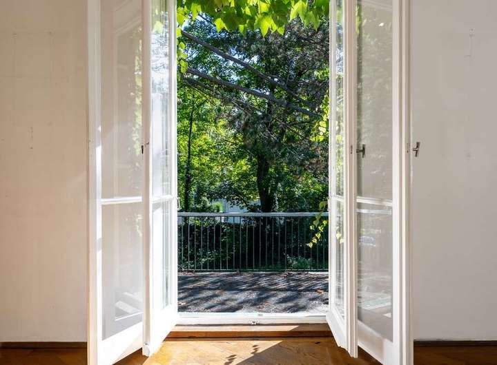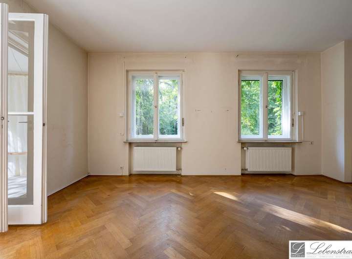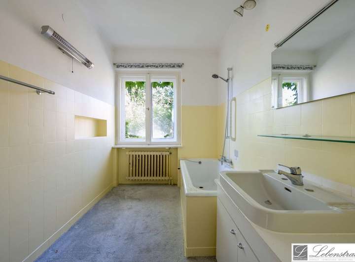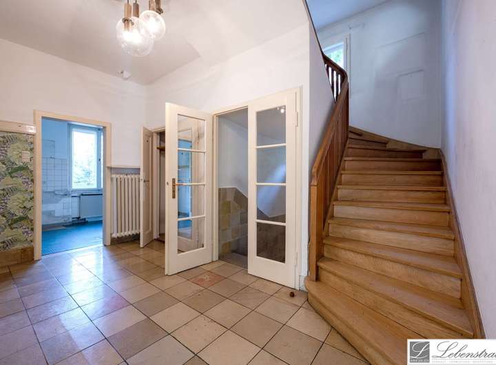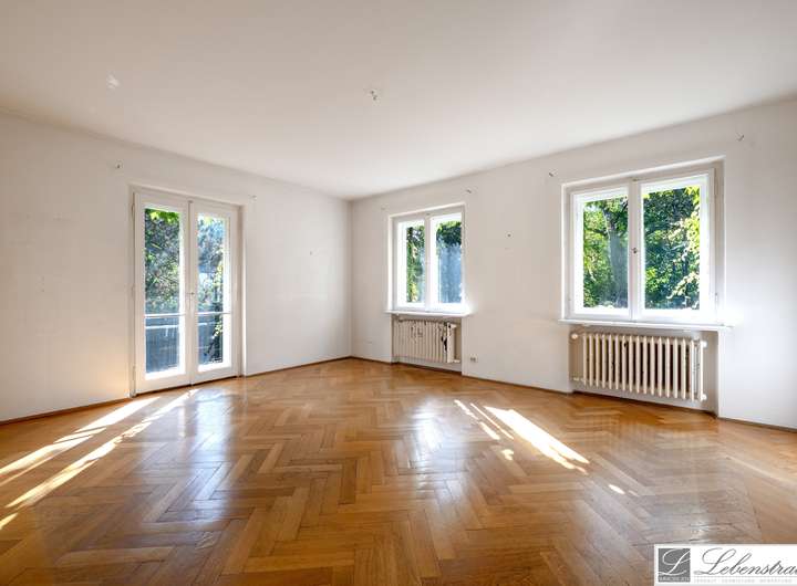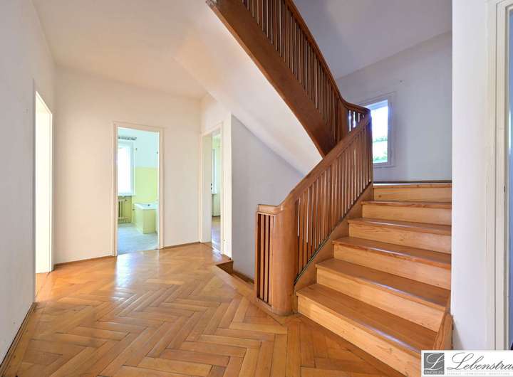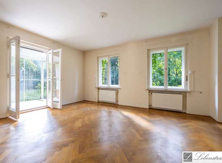 Im Erdgeschoss erwartet Sie ein großzügiger Wohn- und Essbereich mit originalem Parkett, das die Geschichte des Hauses spürbar macht. Von hier gelangen Sie in den Wintergarten und weiter in den weitläufigen Garten, der von altem, majestätischem Baumbestand geprägt ist – eine private Oase mitten in der Stadt.