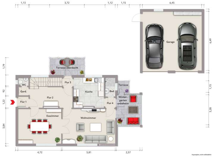 EG: Wohnzimmer, Esszimmer, Küche, Bad, Gäste-WC, Garderobe, Flur; Wintergarten (unbeheizt), Terrasse (überdacht), Garage