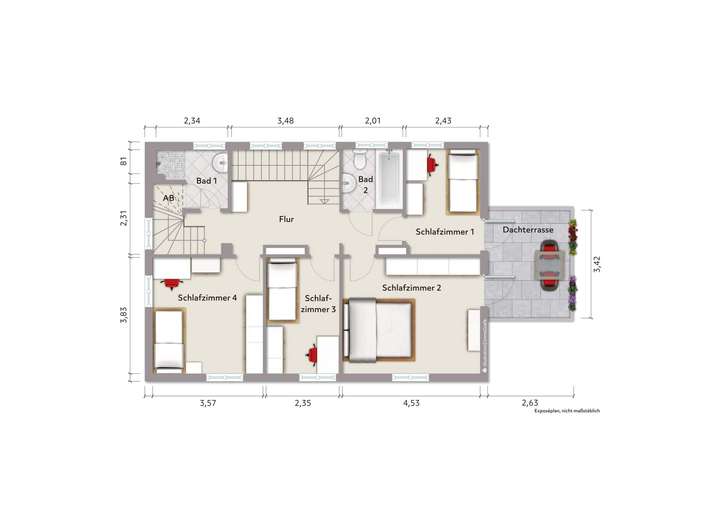 OG: 4 Schlafzimmer, 2 Bäder, Flur; Dachterrasse