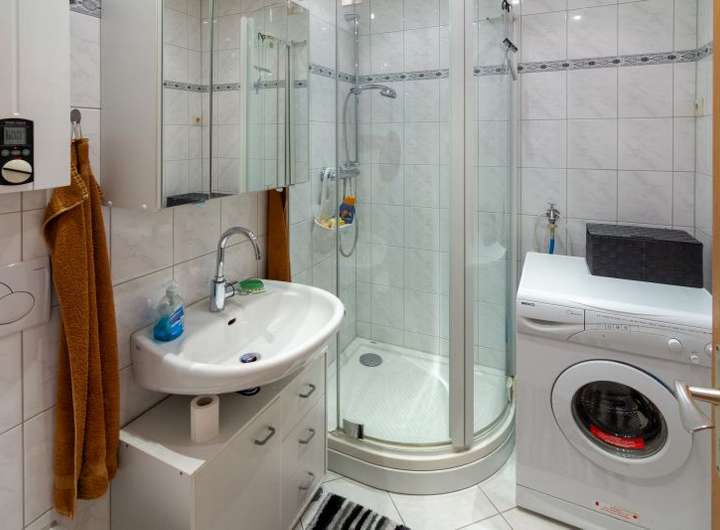 -ein modernes, hell gefliestes Duschbad mit Waschmaschinenanschluss,